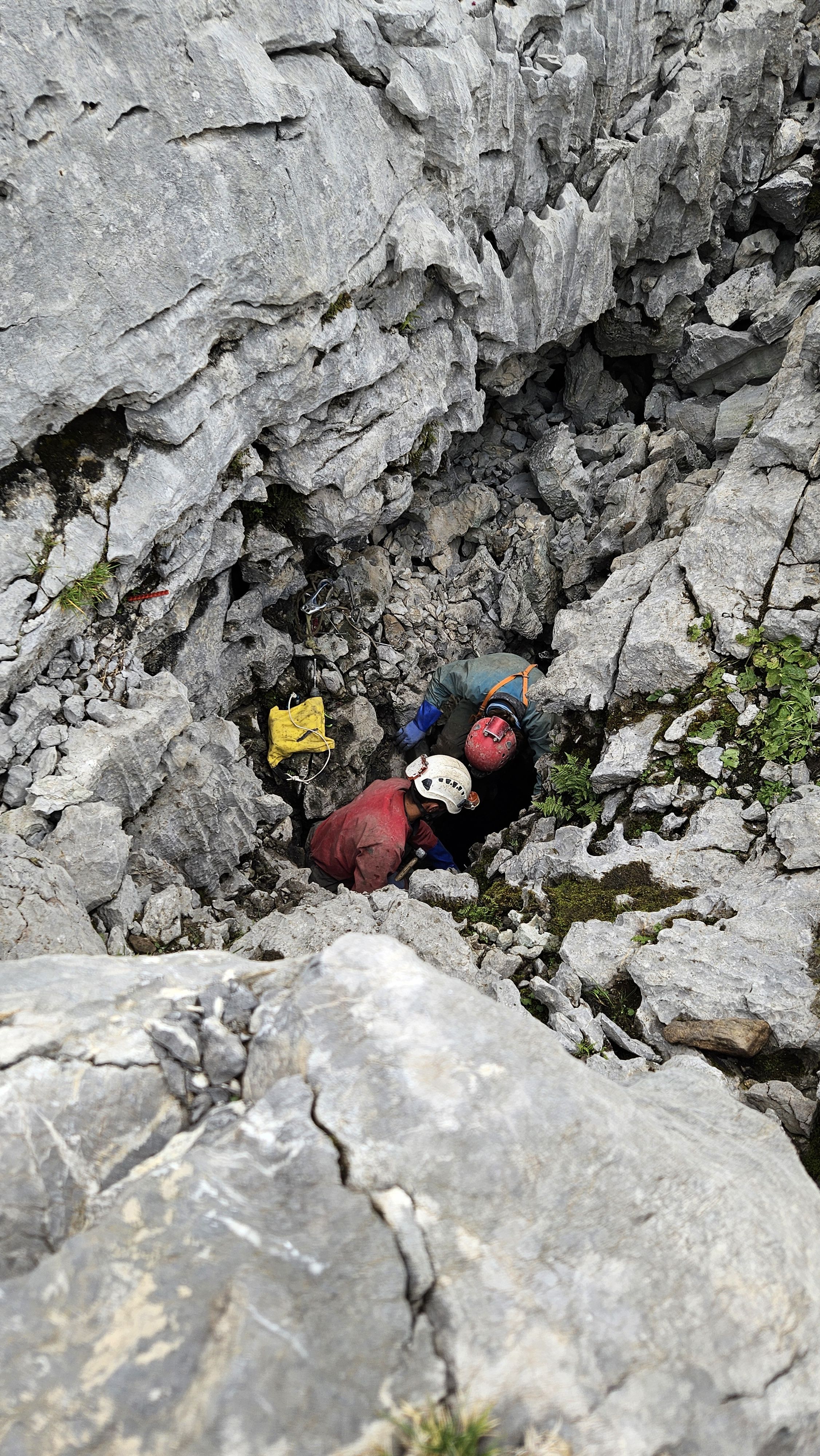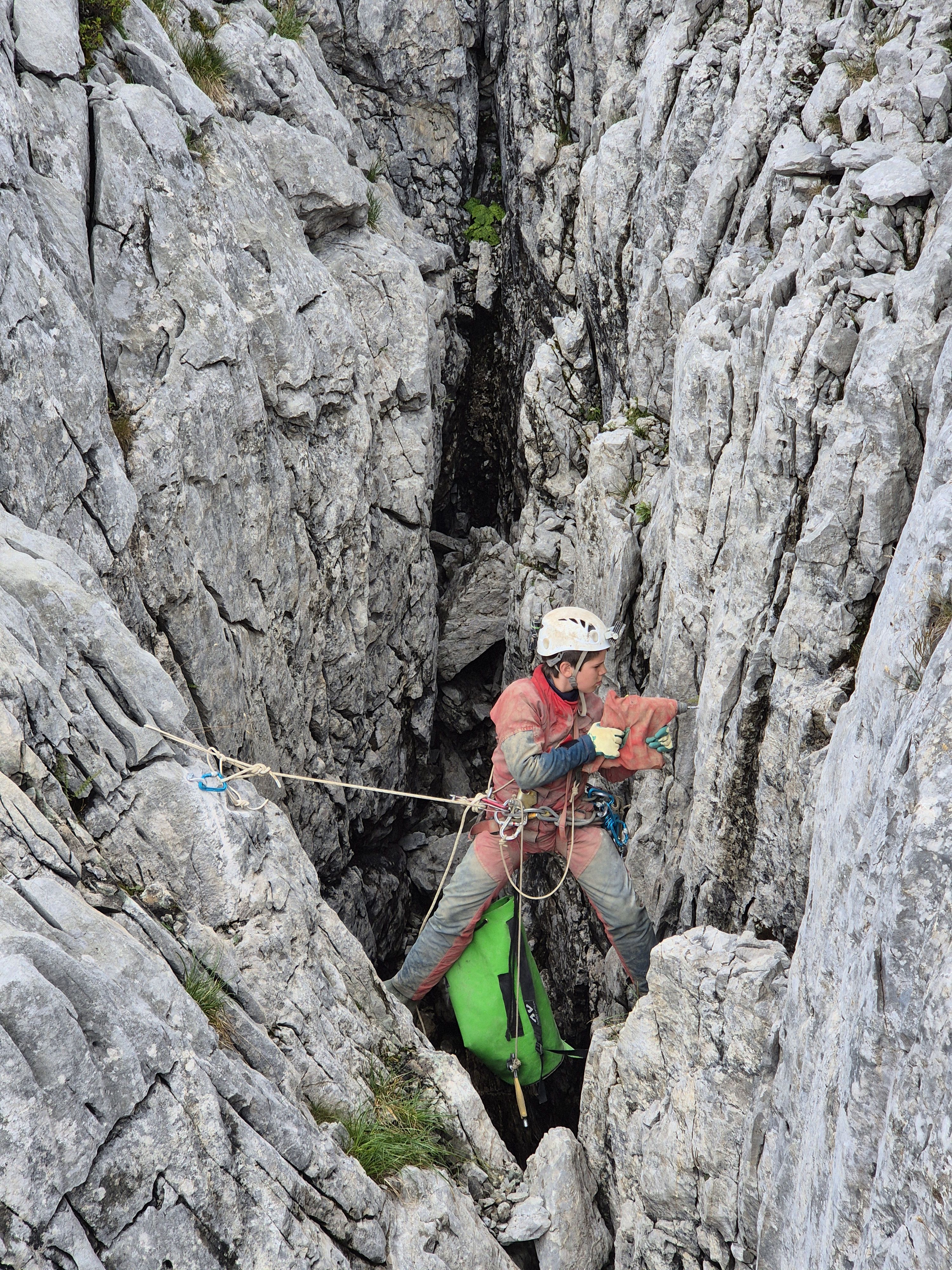 Umso größer war die Freude, als sich das Wetter am Montag besserte und wir mit der eigentlichen Forschungsarbeit beginnen konnten. Neben dem Ausbildungsaspekt lag der Fokus auf der Erkundung neuer Eingänge zum Muschelloch sowie auf einer möglichen Verbindung zwischen dem Silbernsystem und dem Muschelloch. Dafür richteten wir mehrere Kleinhöhlen oberhalb des Bereichs „Einstein-Rosen-Kluft“ ein. Während die jungen Höhlenforscher anfangs noch viel Unterstützung bei der Umsetzung der Vertikaltechnik sowie der GPS-Lokalisation und Vermessung benötigten, arbeiteten sie mit jedem Tag selbstständiger und sicherer.